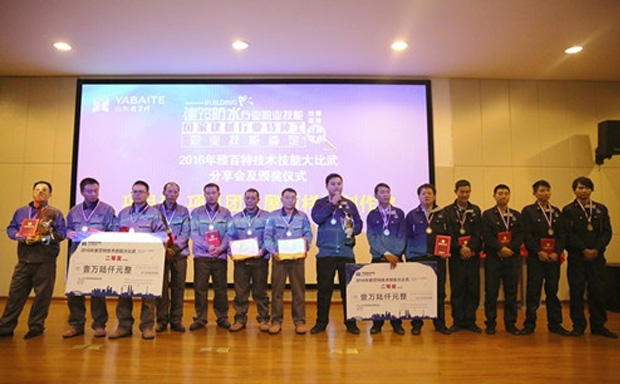 活動最后,在陣陣鞭炮聲中,各位領導和雅百特員工共同見證了“建筑防水行業職業技能培訓基地”、“國家建材行業特種工職業技能鑒定培訓基地”的掛牌儀式。自此,全國首家“建筑防水行業職業技能培訓基地”、“國家建材行業特種工職業技能鑒定培訓基地”正式掛牌成立。